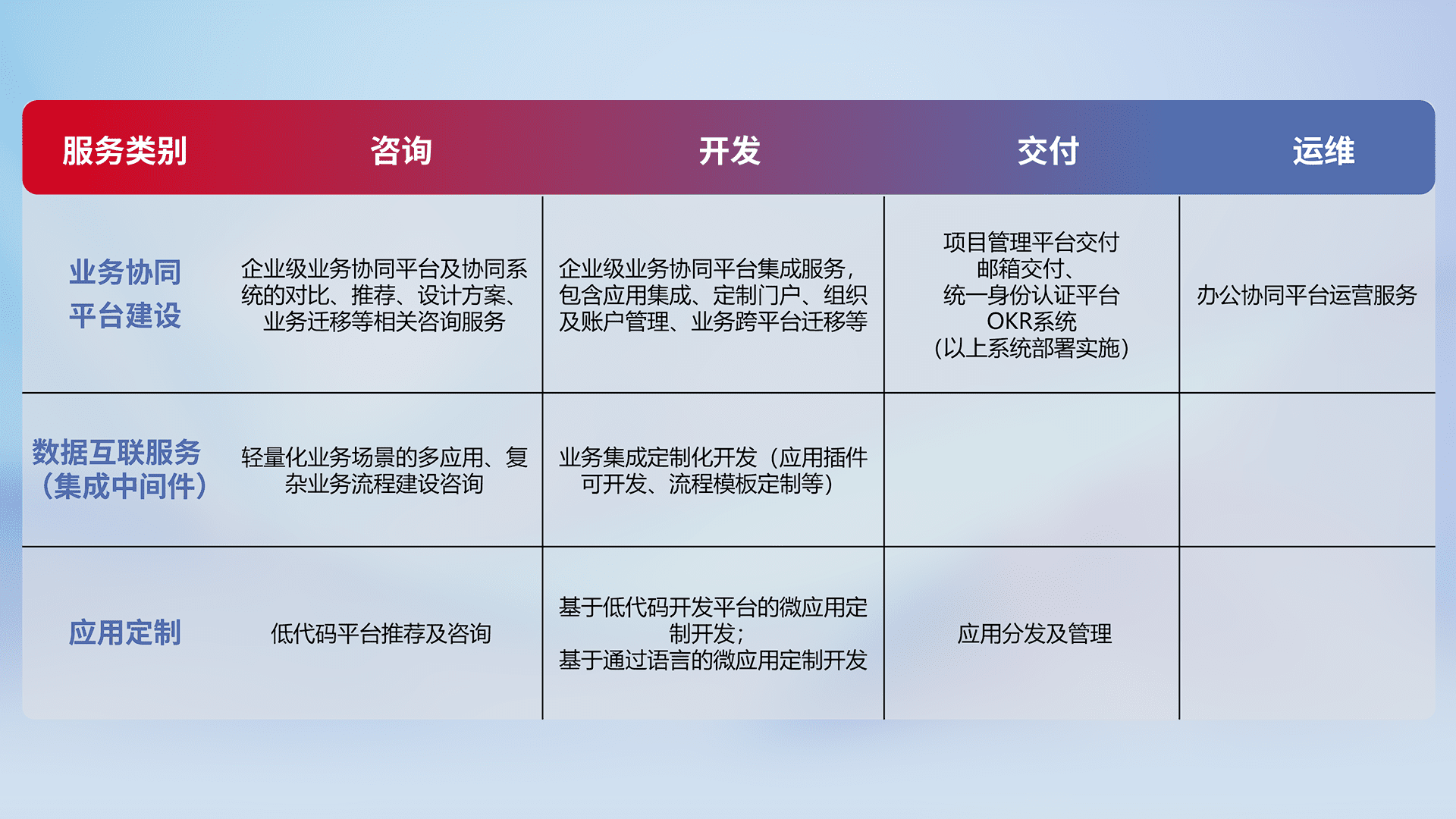 针对钉钉、、企微、、、IDaas等平台级产品提供产品的规划、、方案、、、、交付、、定制化开发等服务,,,实现如统一协同办公、、、、智能客户服务、、、、混合会议管理、、智能数据查询、、、、等业务场景,,,,实现数字化转型。。。