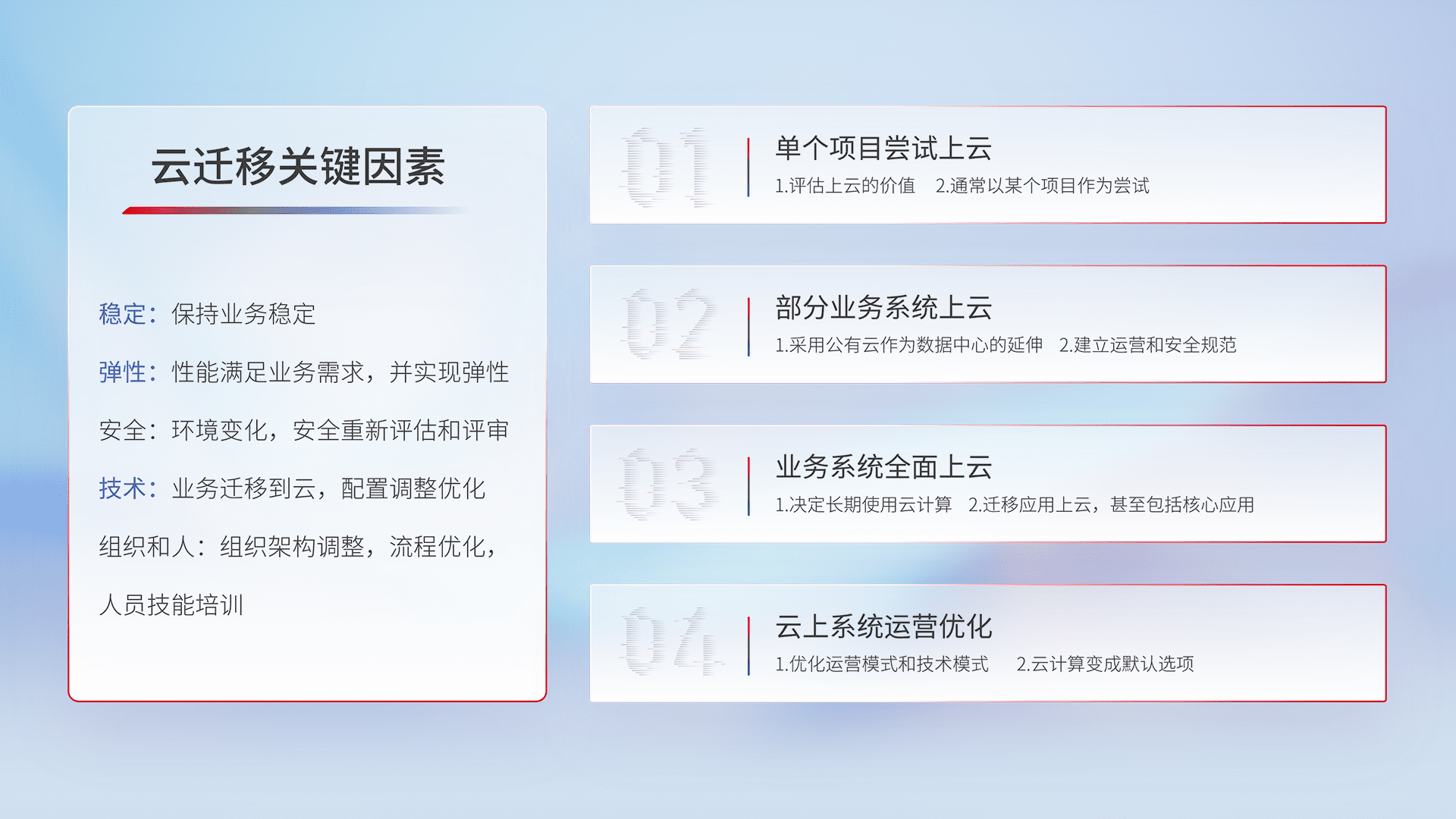 结合实际业务,,,,从规划设计、、、云平台选型、、云原生改造、、数据迁移、、、、集成交付,,迁移全过程为客户识别最佳上云路径,,,,做好风险识别管理,,设计网络架构、、、、身份权限、、、安全审计合规、、、、操作审计、、、、日志审计、、、监控告警策略、、、、多站点容灾设计等,,,,对云上基础设施进行整体规划,,提升IT治理水平,,以满足弹性、、、、高可用、、、、高性能的需求。。。