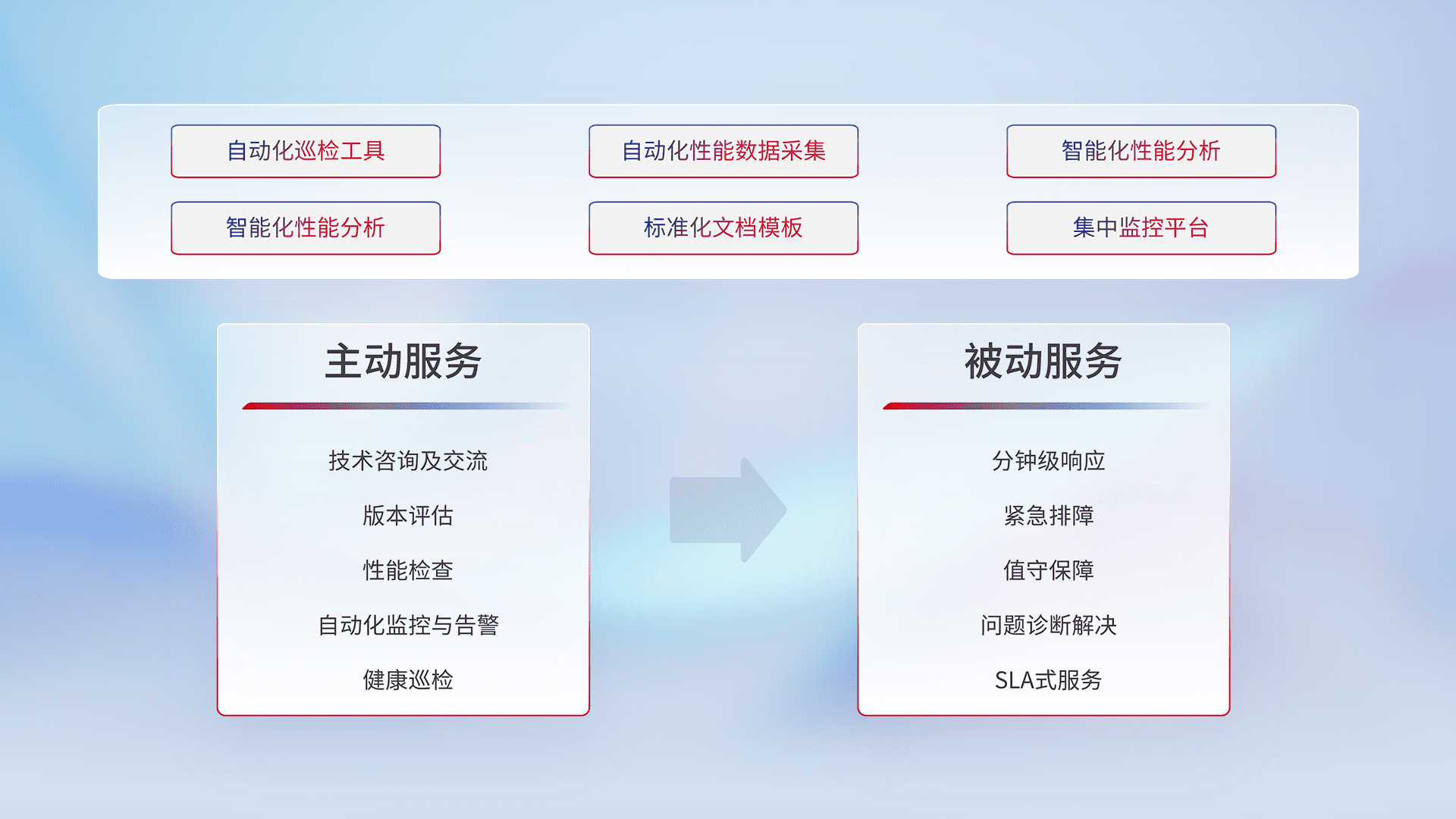 智能化工具和标准化文档,,,保障服务质量,,,提供主动服务(包含技术咨询、、、、版本评估、、、性能检查、、自动化监控与告警、、、、健康巡检)和被动服务包含(分钟级响应、、、、紧急排障、、、、值守保障、、、问题诊断解决、、、、SLA服务)。。。。