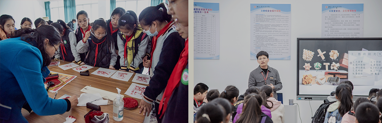 在大学生活动中心里陈列了许多由生活中创生出的非遗文化展品,,,同学们通过观摩活字印刷、、拓印、、鲁班锁、、锡火烫印、、3D打印等精美作品,,,,感受工业艺术的美与智慧。。。