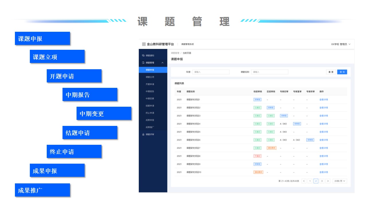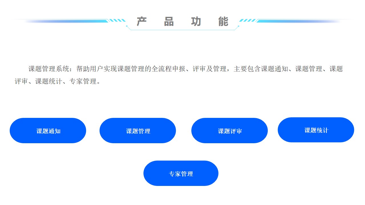 课题管理系统,,帮助用户实现课题管理业务的全流程申报、、评审及管理,,,提高课题管理业务的效率和质量,,,为用户提供更好的工作体验和管理支持。。。