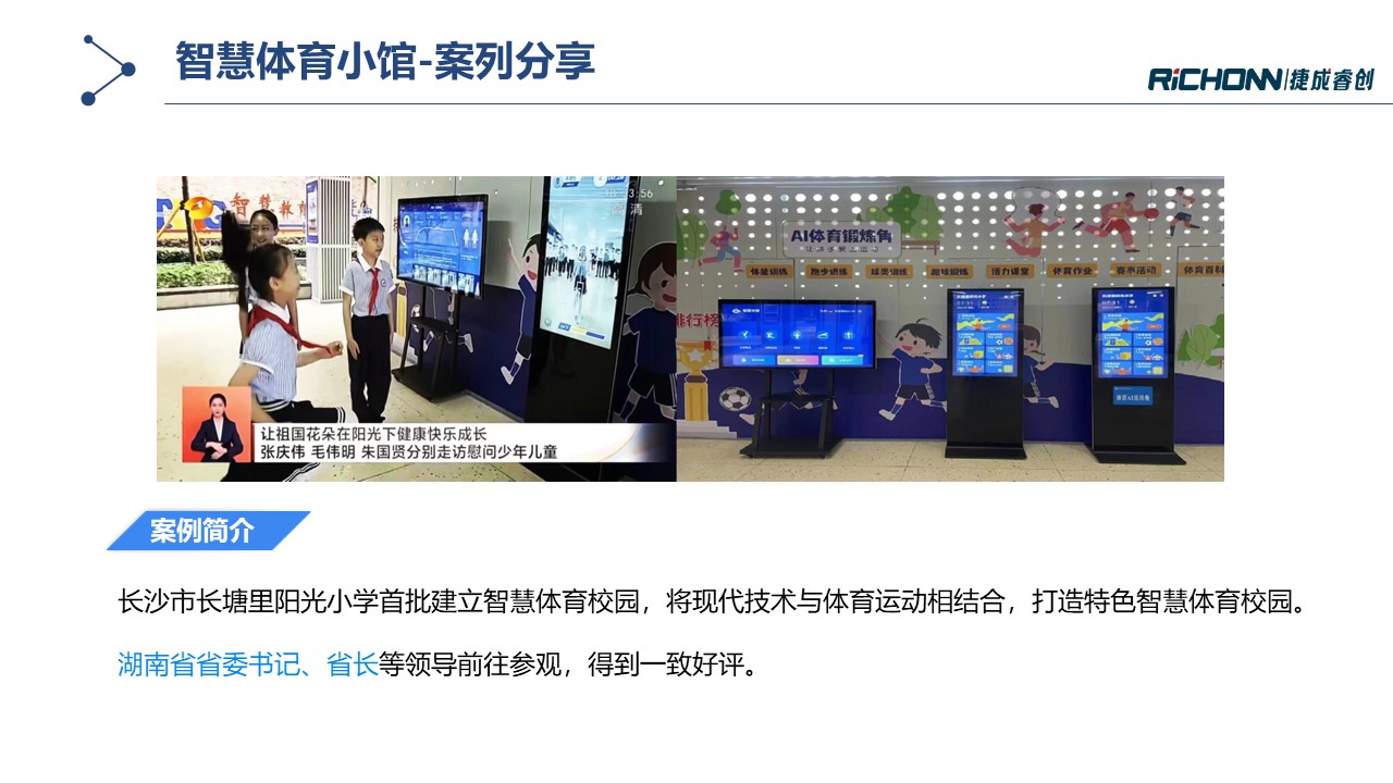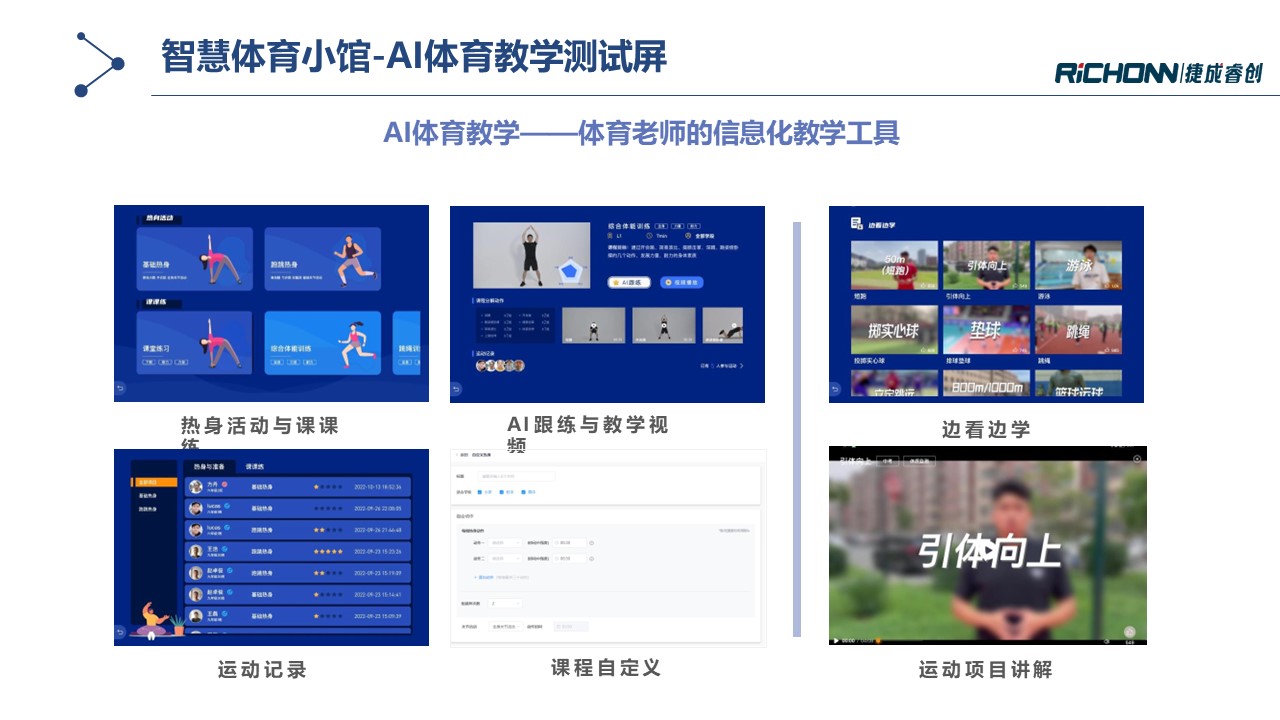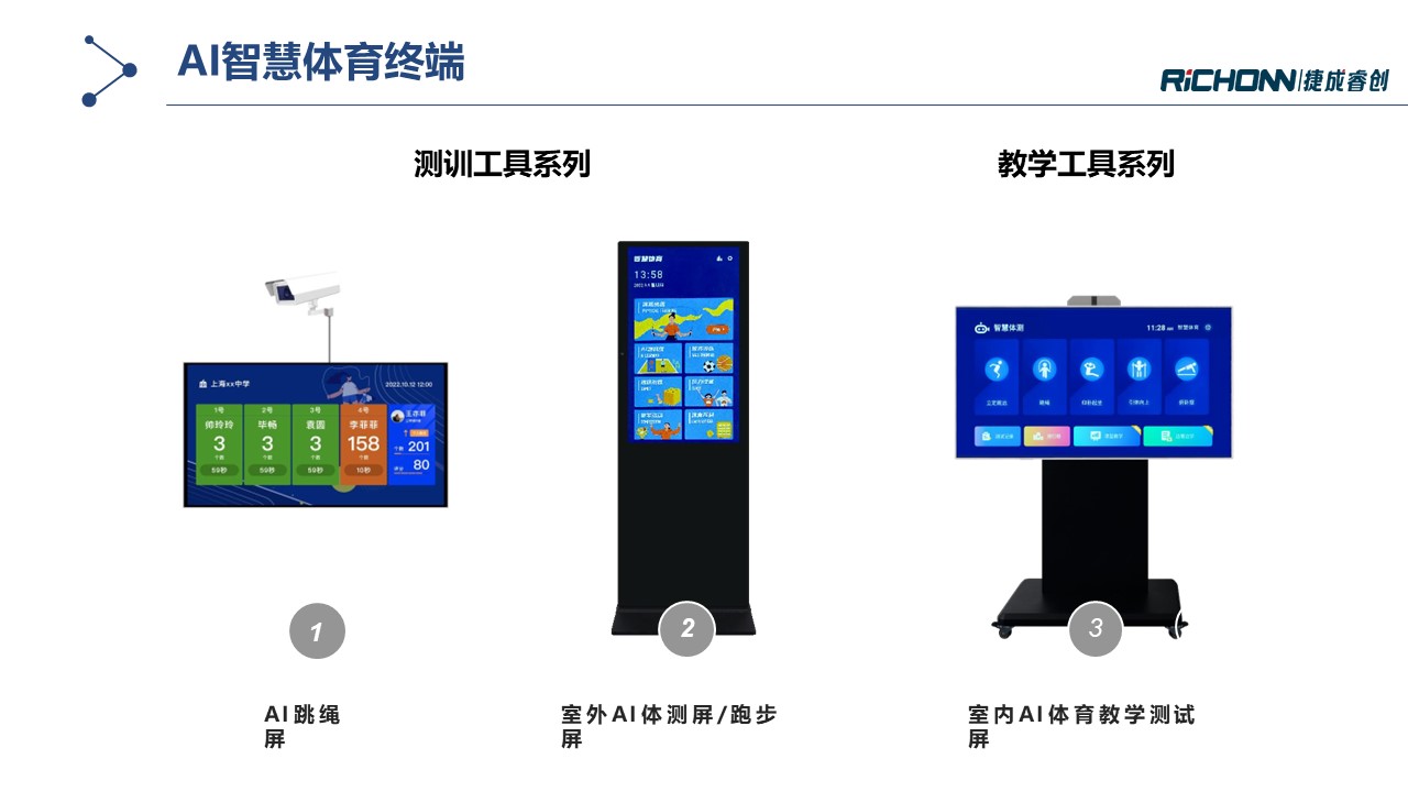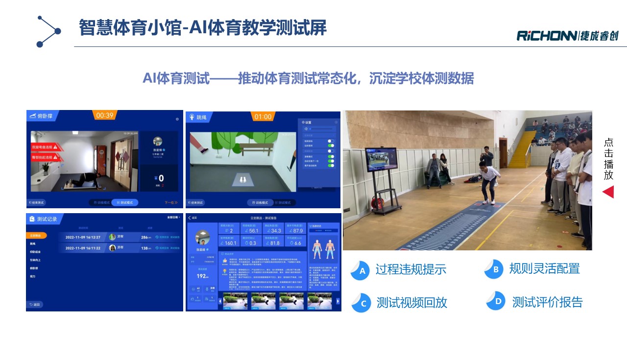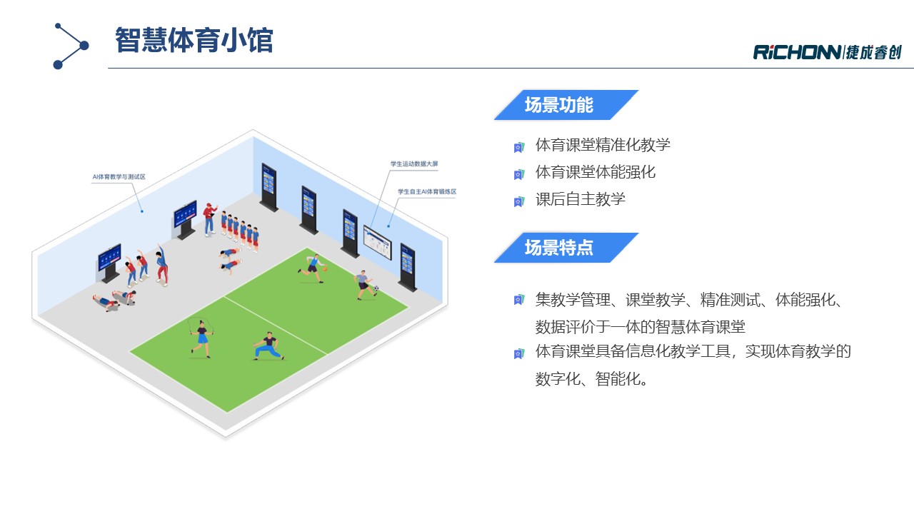 智慧体育小馆通过多种AI体育锻炼及测试设备构建体育实训室,,,旨在提升校园运动氛围培养学生运动兴趣,,围绕运动能力发展建立智能评测体系,,同时培育专业教师队伍,,,增强教学综合能力。。。