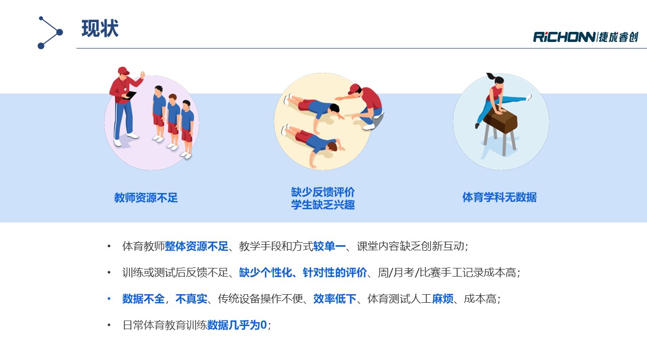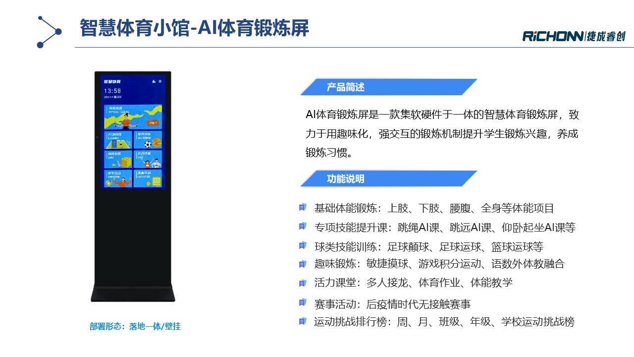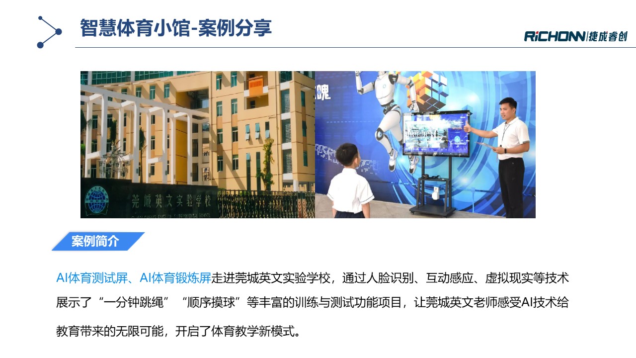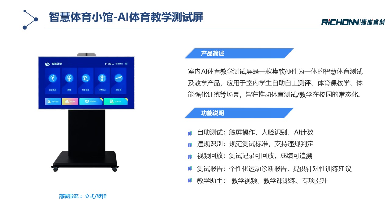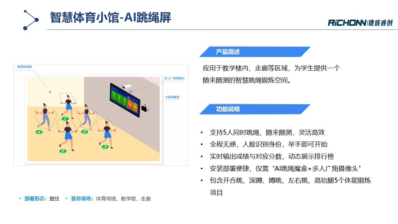 智慧体育小馆通过多种AI体育锻炼及测试设备构建体育实训室,,,旨在提升校园运动氛围培养学生运动兴趣,,围绕运动能力发展建立智能评测体系,,同时培育专业教师队伍,,,增强教学综合能力。。。